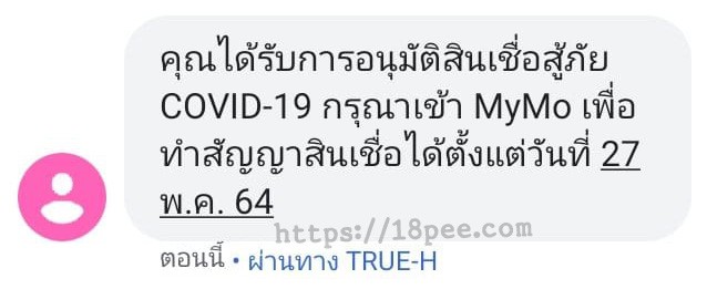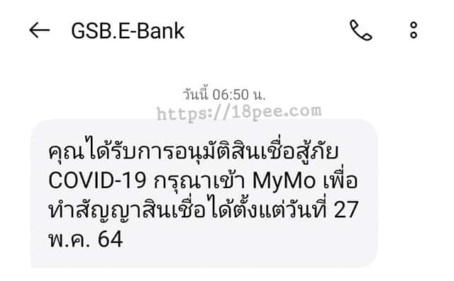 ท่านจะได้รับ SMS แจ้งว่า คุณได้รับการอนุมัติสินเชื่อสู้ภัย COVID-19 กรุณาเข้า MyMo เพื่อทำสัญญาสินเชื่อได้ตั้งแต่วันที่ 27 พ.ค. 64