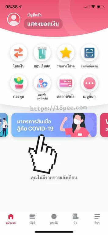 เมื่อเข้าหน้าแอปมายโมแล้วในป้ายด้านล่างให้ท่านปัดซ้าย ปัดขวาเพื่อหาป้ายสีม่วงๆ มาตรการสินเชื่อสู้ภัย COVID-19