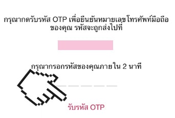 กรุณากดรับรหัส OTP เพื่อยืนยันหมายเลขโทรศัพท์มือถือของคุณ รหัสจะถูกส่งไปยังเบอร์ xx xxxx xxxx กรูรากรอกรหัสของคุณภายใน 2 นาที