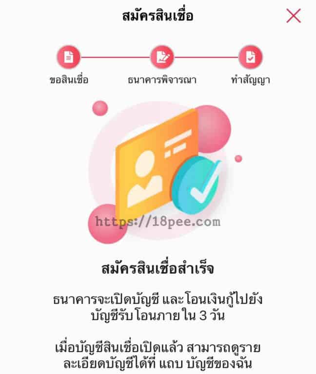 เมื่อทุกอย่างเรีบบร้อยแล้วระบบจะแจ้งว่า “ทำสัญญาเรีบบร้อยแล้ว ธนาคารจะโอนเงินกู้ไปยังบัญชีเงินฝากภายใน 3 วัน”
