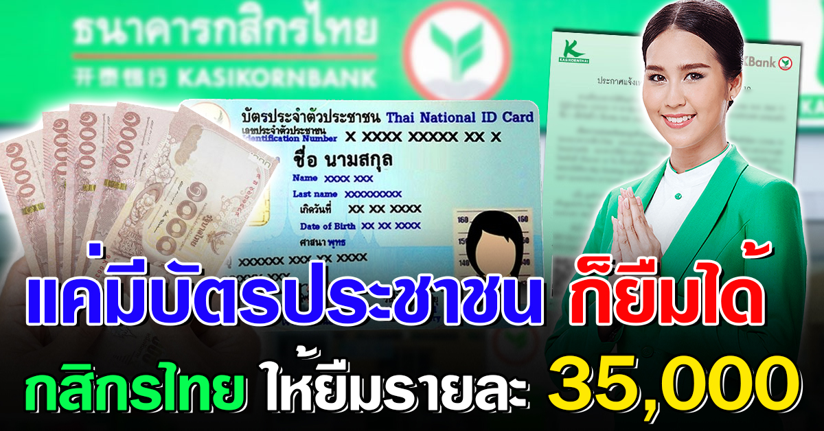 กสิกรไทย แค่มีบัตรประชาชน ให้ยืมรายละ 35,000 บา ท