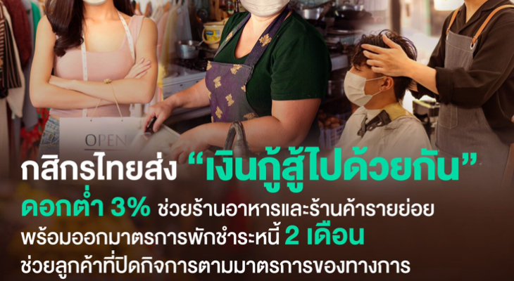 กสิกรไทย จึงได้จัดให้มีโครงการพิเศษ “เงินกู้สู้ไปด้วยกัน” เพื่อลดภาระและเสริมสภาพความคล่องให้กับผู้ประกอบกิจการ โดยคิดอัตราดอกเบี้ยในราคาถูกเพียง 3% และสามารถพักชำระเงินต้นได้นานถึง 3 เดือนทางธนาคารได้กำหนด อนุมัติวงเงินสูงสุดไว้ถึง 3oo,ooo บๅท โดยไม่ต้องมีหลักค้ำประกัน และฟรีค่าธรรมเนียมทุกประเภท และกำหนดระยะเวลาในการชำระคืนแก่ธนาคาร ได้นานสูงสุดถึง 5 ปี
