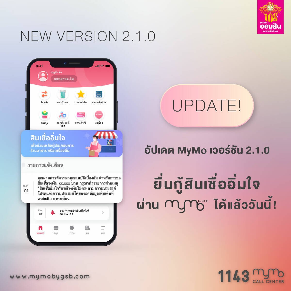 สำหรับสินเชื่อ “อิ่มใจ” ธนาคารออมสิน เปิดให้ผ่านแอปฯMyMo เท่านั้น และ ต้องอัปเดต MyMo เป็นเวอร์ชันล่าสุด 2.1.0
