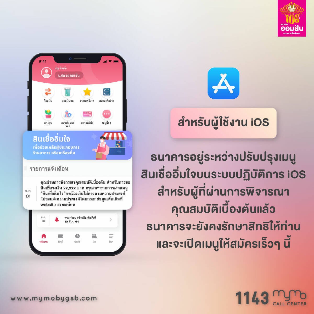 ธนาคารอยู่ระหว่างปรับปรุงเมนูสินเชื่ออิ่มใจบนระบบปฏิบัติการ iOS สำหรับผู้ที่ผ่านการพิจารณาคุณสมบัติเบื้องต้นแล้ว ธนาคารจะยังคงรักษาสิทธิให้ท่านและจะเปิดเมนูให้สมัครเร็ว ๆ นี้