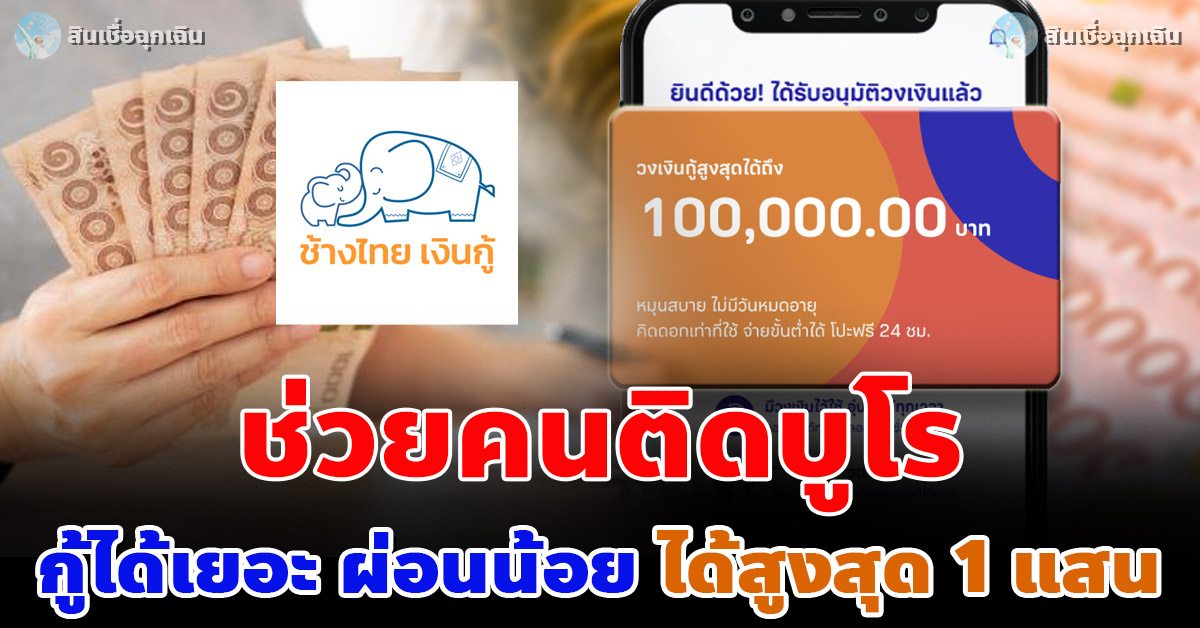 ช้างไทย เงินกู้ ให้วงเงิน 100,000 บาท ช่วยเหลือ คนติดบูโร ก็ยืมได้