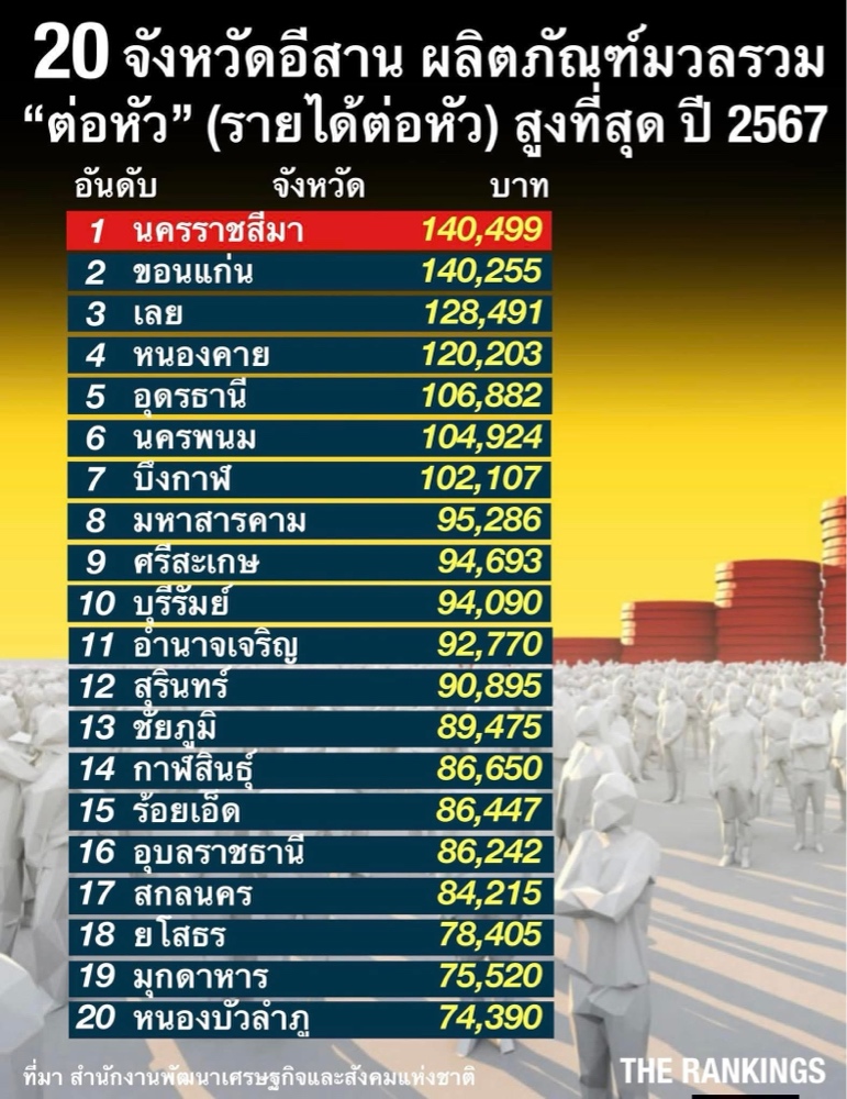 จากข้อมูลล่าสุดโดย สำนักงานสภาพัฒนาการเศรษฐกิจและสังคมแห่งชาติ เราได้จัดอันดับ 20 จังหวัดในภาคอีสานที่มีรายได้ต่อหัวสูงสุด ดังนี้: